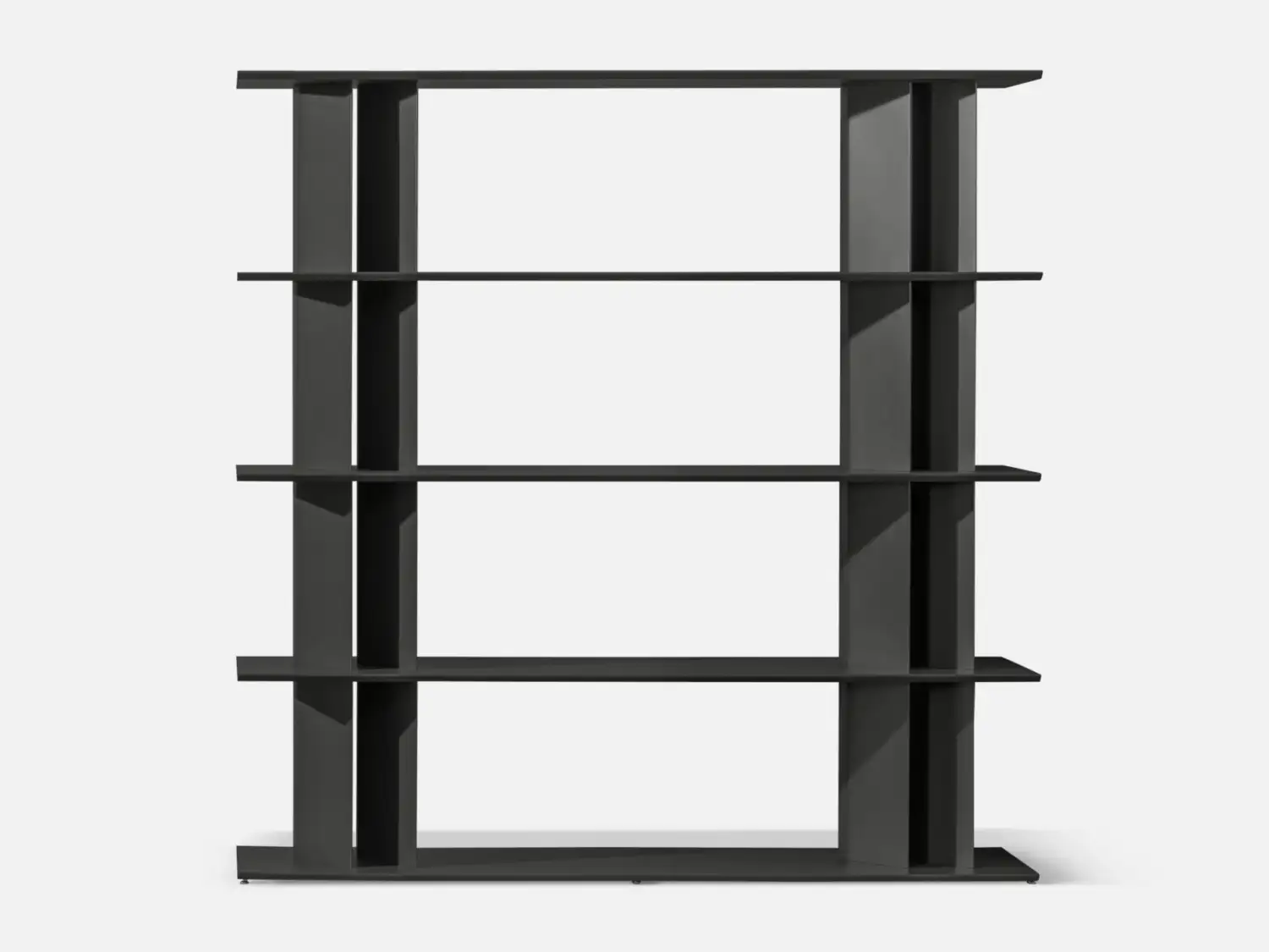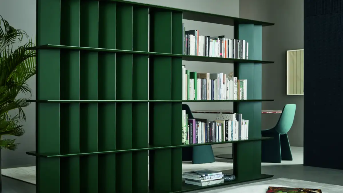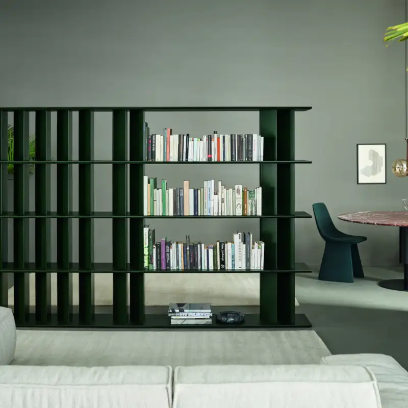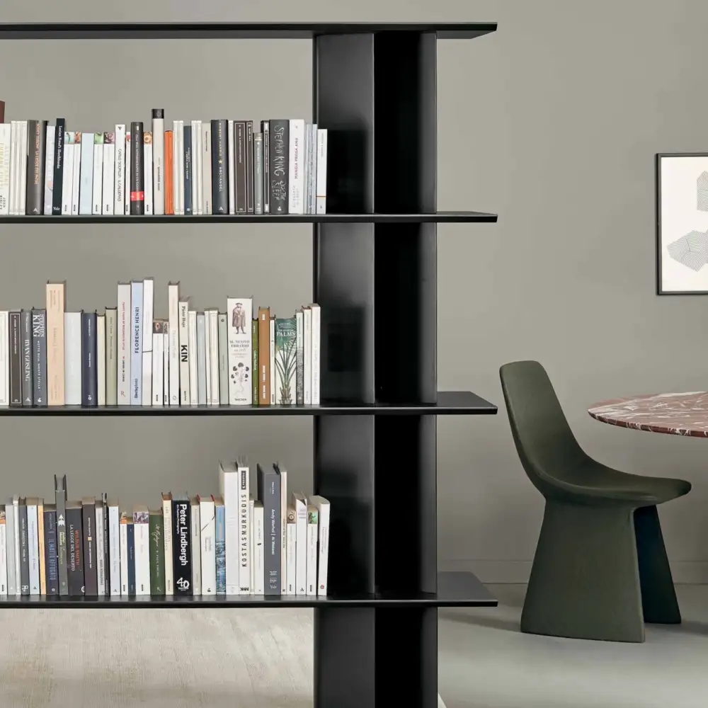 Designer Alain Gilles's DOGMA bookcase is a playful exploration of shape and form. By juxtaposing different modules, he creates a variety of visual effects, transforming the simple act of storage into an engaging aesthetic experience. The tear-drop-shaped uprights subtly shift the visual perception, offering a rounded or sharper profile depending on the viewer's perspective.