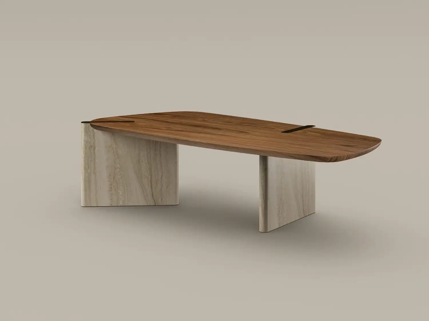 The FLATIRON Dining Table by Bonaldo blends sculpted travertine and rich timber for a look that feels both grounded and refined. Its bold form and moody palette bring a modern, elemental elegance to any space.