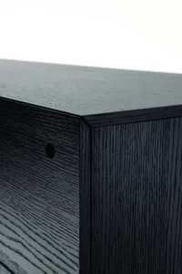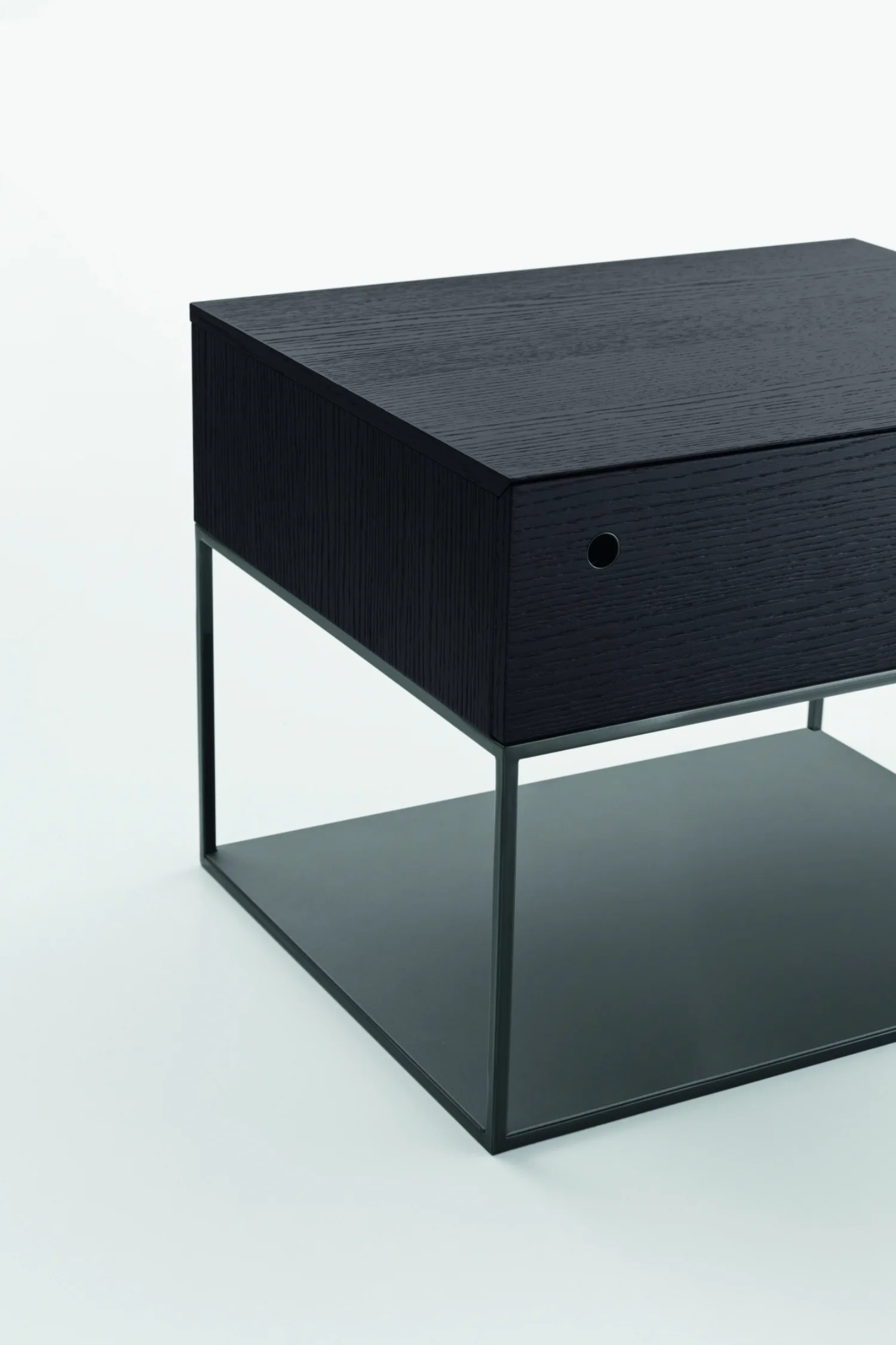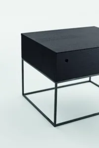 A minimalist bedside table with a touch of structured elegance. Sophisticated metal accents and unique handles complete the look.