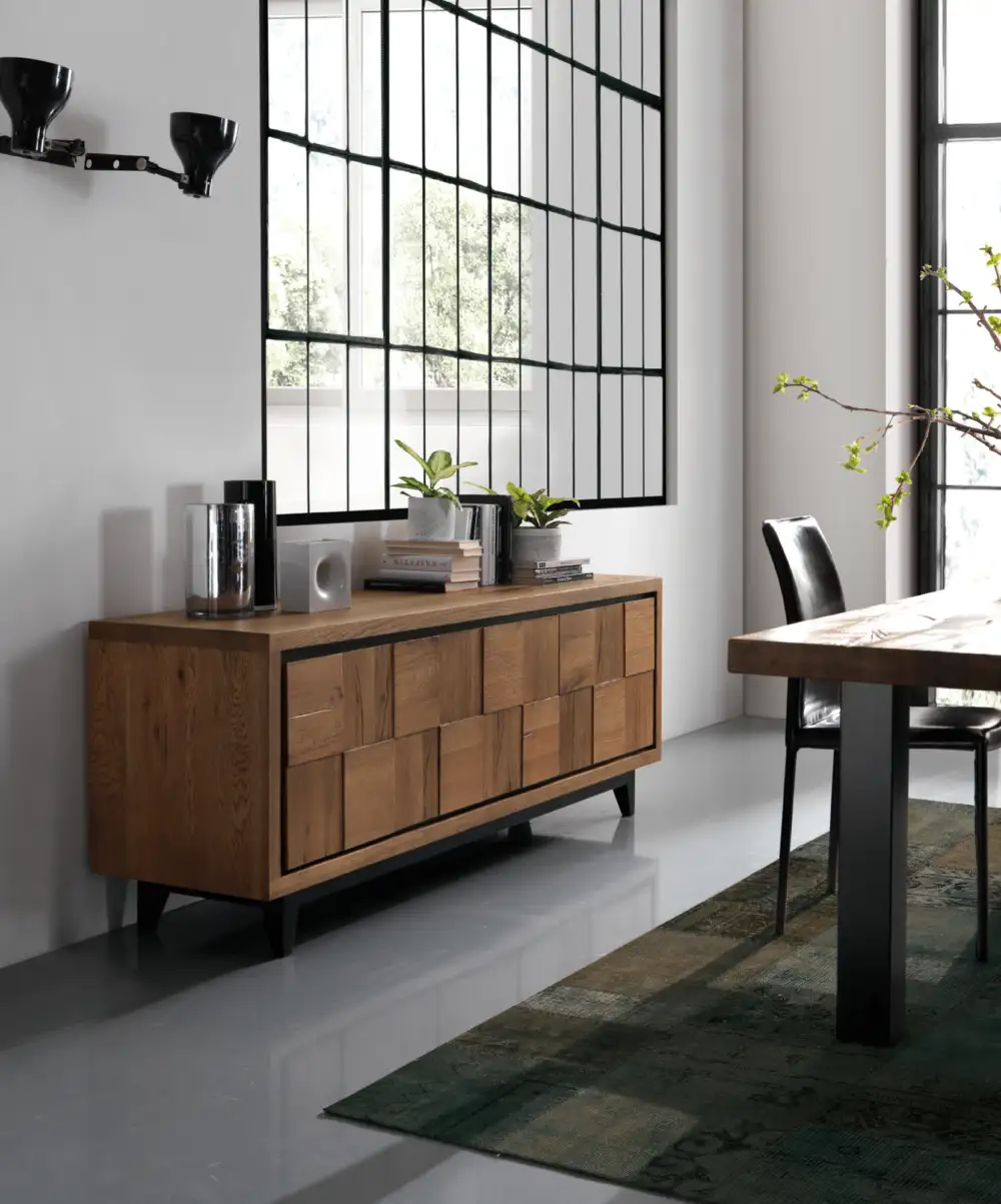 The Buddy 3D Buffet by Oliver B of Italy is made of solid wild oak with a feature faceted front creating texture. Available to be ordered in a range of different stains (natural, natural light, antique, desert, white wash, grey wash or dark brown).