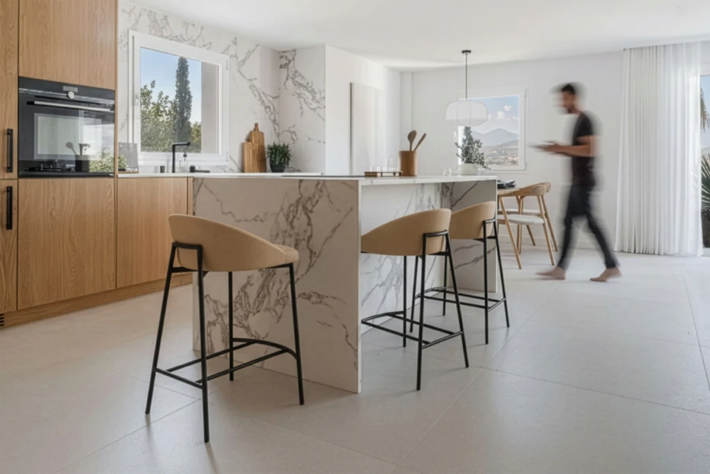 The MICK plays with contrasting curves and angular lines to create a striking yet sophisticated barstool. A unique detail is how the metal frame extends up the back and hugs the seat for added support and visual interest. Its low back, padded seat, and textured fabric makes it ideal for modern kitchens, bars or high dining areas.