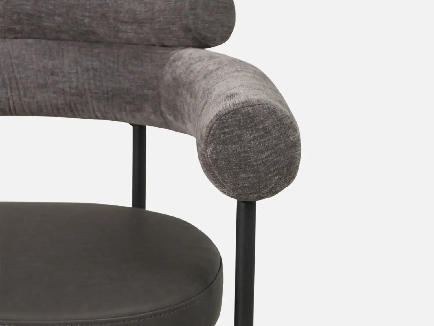 ALITA brings a modern sculptural touch to your dining setting. Its distinctive rolled backrest and arms wrap gently around a generously cushioned seat, offering both comfort and visual interest. A slim, black frame keeps the silhouette light and refined, making it a versatile choice for contemporary, minimalist, or eclectic interiors. Perfect for long dinners and lively conversations, it’s a chair that pairs style with everyday ease.