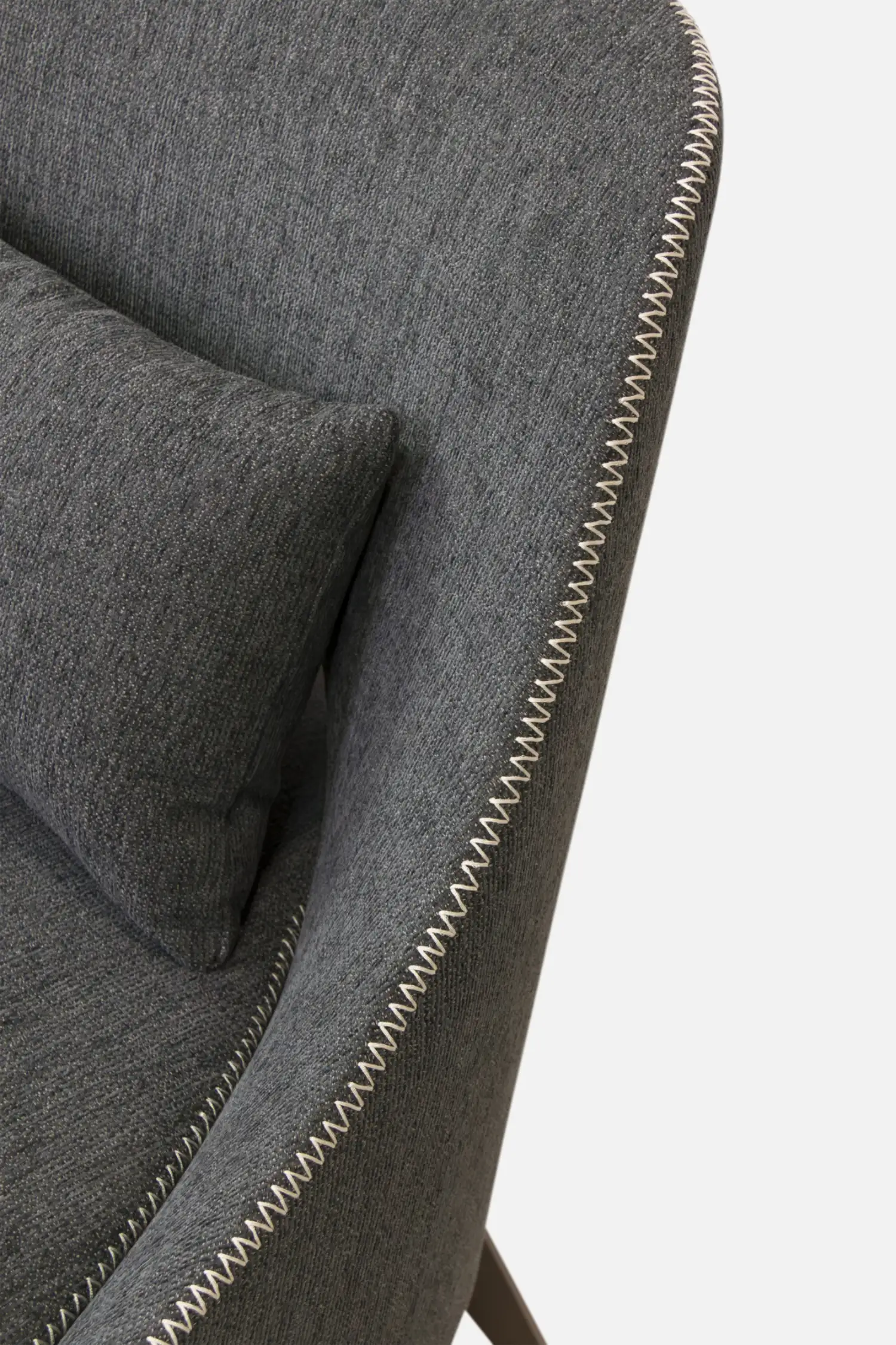 A timeless chair with a spacious, comfortable seat and elegant curved lines. The high back provides added support, while fabric upholstery and contrast stitching enhance its contemporary style. Finished with a matching seat cushion for extra comfort.