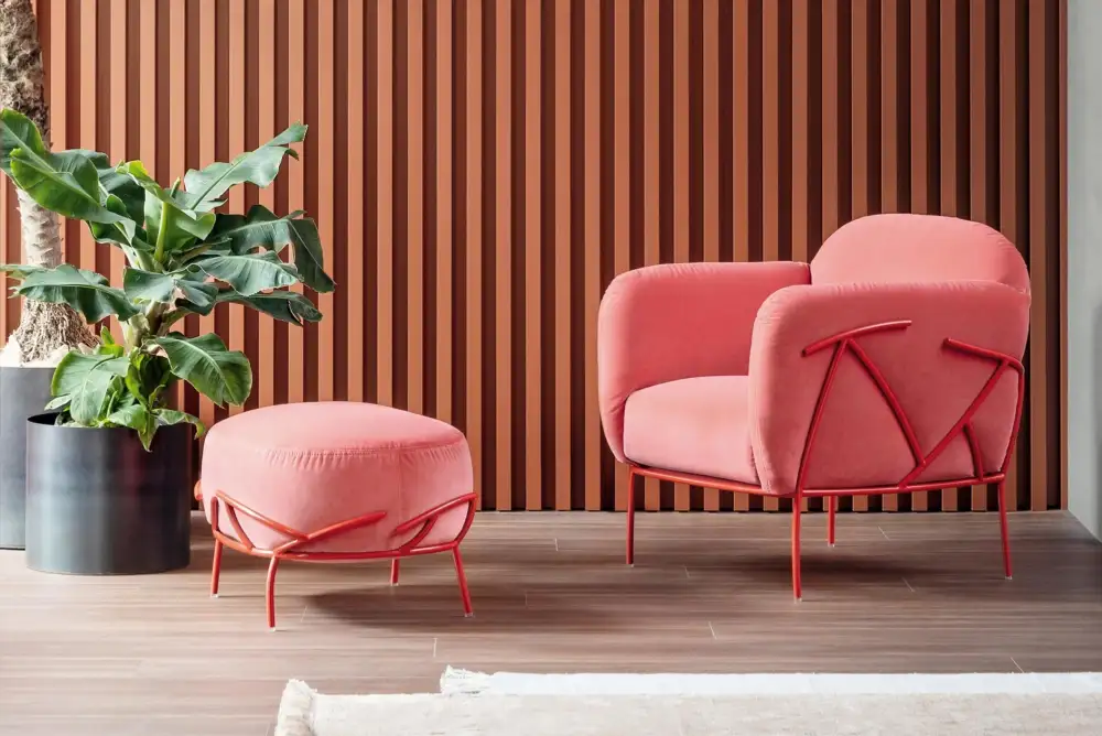 CORALLO Accent-Chair + Stool in CatMust-MC12 Coral Fabric with Coral Frame