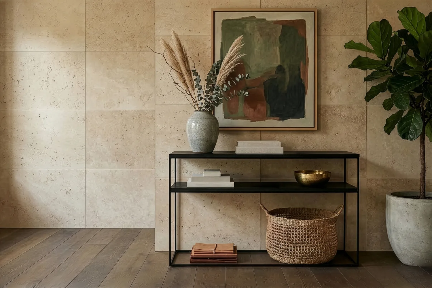 Slim, structured and modern CAMDEN brings refined function to entryways and living spaces. Crafted in richly grained oak with a minimalist metal frame, it features a practical lower shelf for styling or storage, creating a light, architectural look that complements a wide range of interiors.