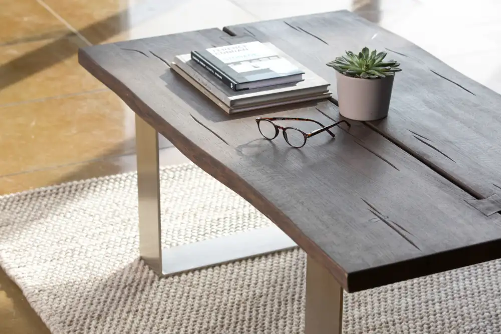 The Luxemburg coffee table has a solid oak top with beautiful a 'butterfly' shaped insert, which creates a subtle and unexpected design feature. Distressed wood is contrasted by a contemporary brushed stainless steel base.