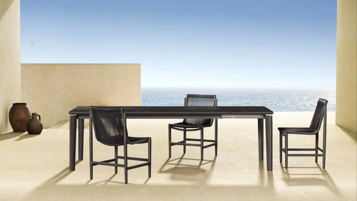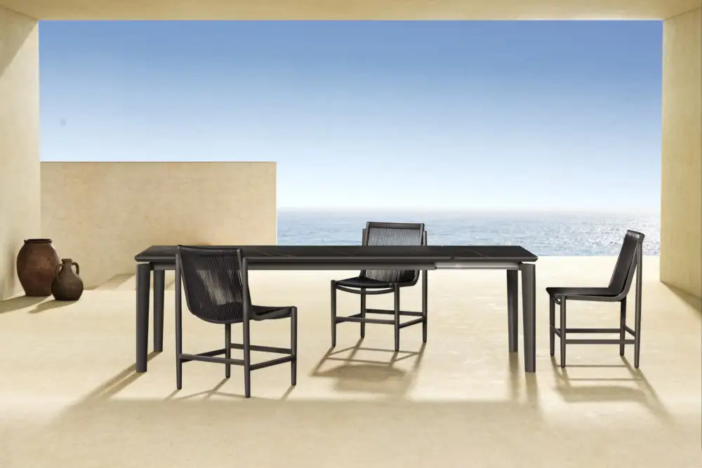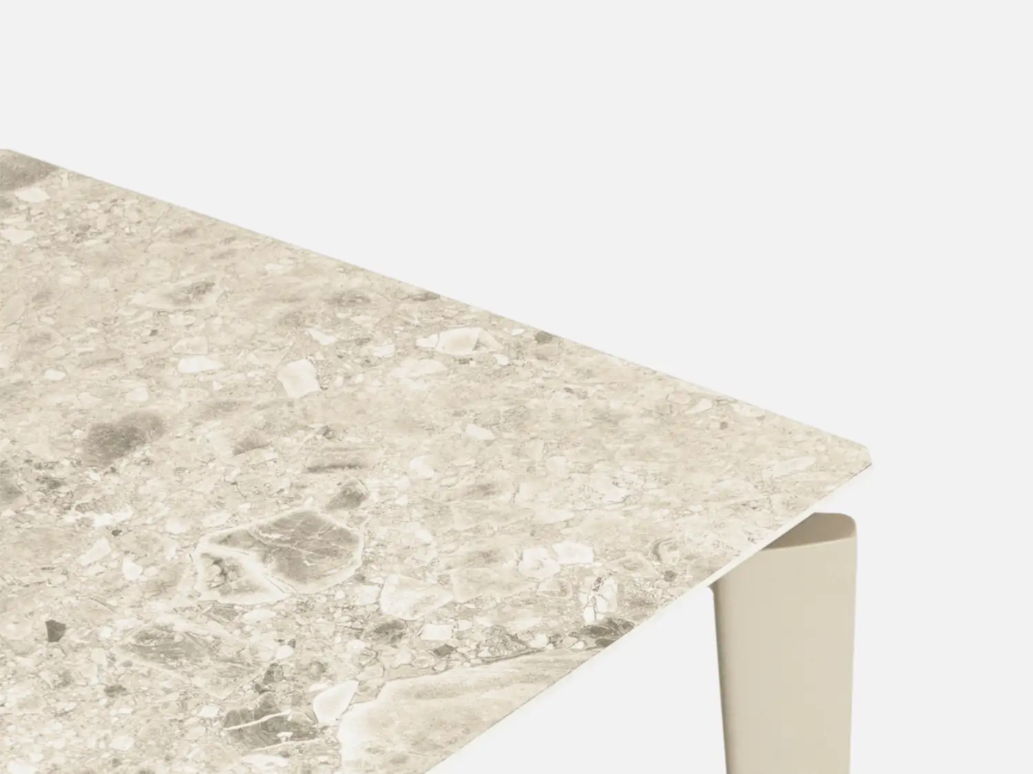 A statement piece for your dining space. This generously sized extension table allows for small intimate dinner parties, or large family meals. Choose from the timeless beauty of terrazzo ceramic with a sand aluminium frame, or the modern sophistication of charcoal ceramic with an anthracite aluminium frame.