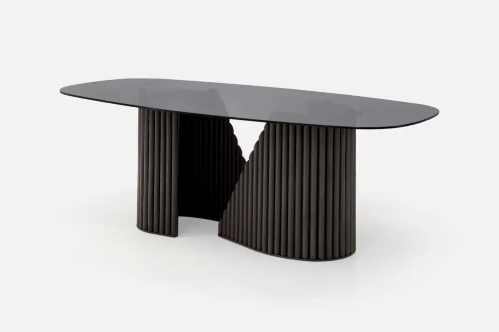 Designed in New Zealand, the FITZROY Dining Table is an ode to the Great Barrier Island coastline with its organic shapes, deep colour palette and contrasting materials. Inspired by Fitzroy Harbour, the bases mimic the mountains that dive into the depths of the ocean. The wood grain and warmth of the solid American oak peers through the dark wash of the slats. The smoked glass top gives a glimpse into the unique shapes of the base making this table a true piece of art at all angles.