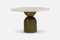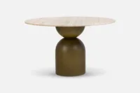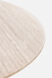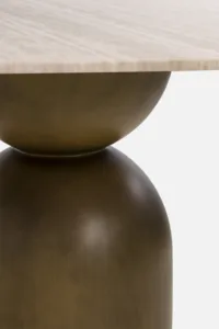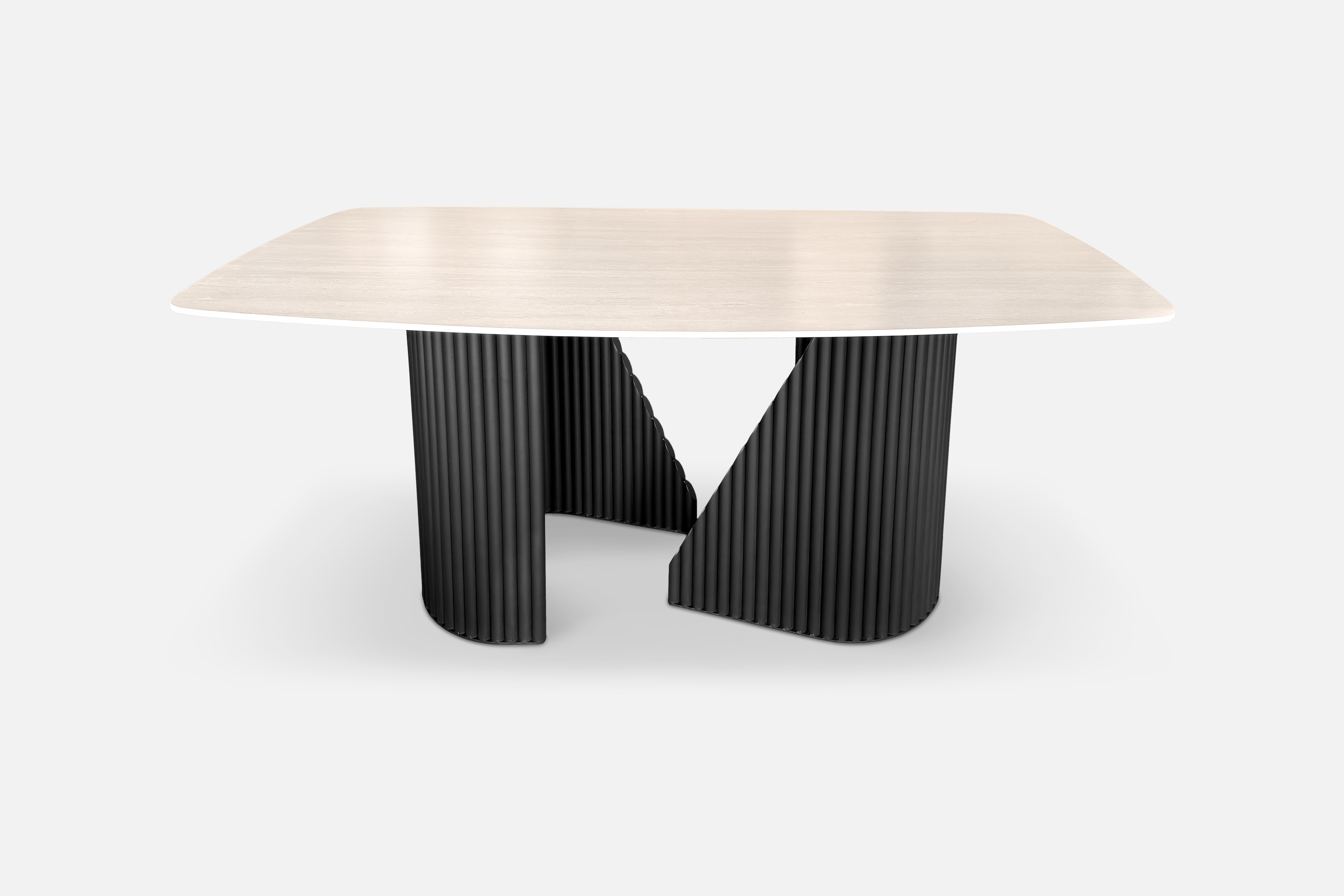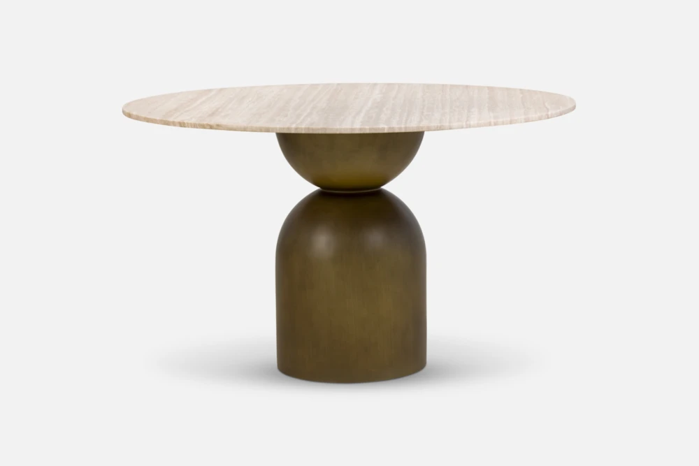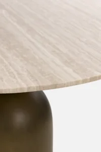 Drawing inspiration from the graceful form of a vase, VASO brings soft curves and balanced proportions to the dining space. A rounded, sculpted base supports a travertine top, creating a piece that feels grounded, refined, and quietly artistic.