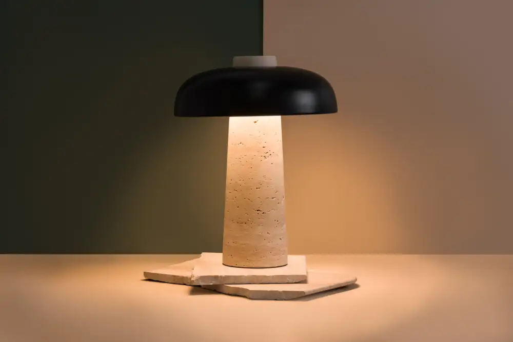 With its sculptural silhouette and natural materials, PORCINI is a study in refined simplicity. A smooth travertine base grounds the design, while the black dome shade casts a warm, focused light. Equal parts statement piece and everyday essential, it’s perfect for bringing soft illumination and quiet elegance to any space.