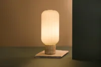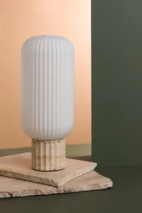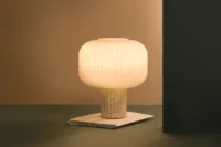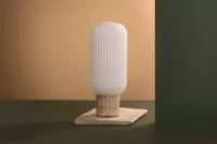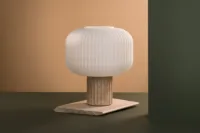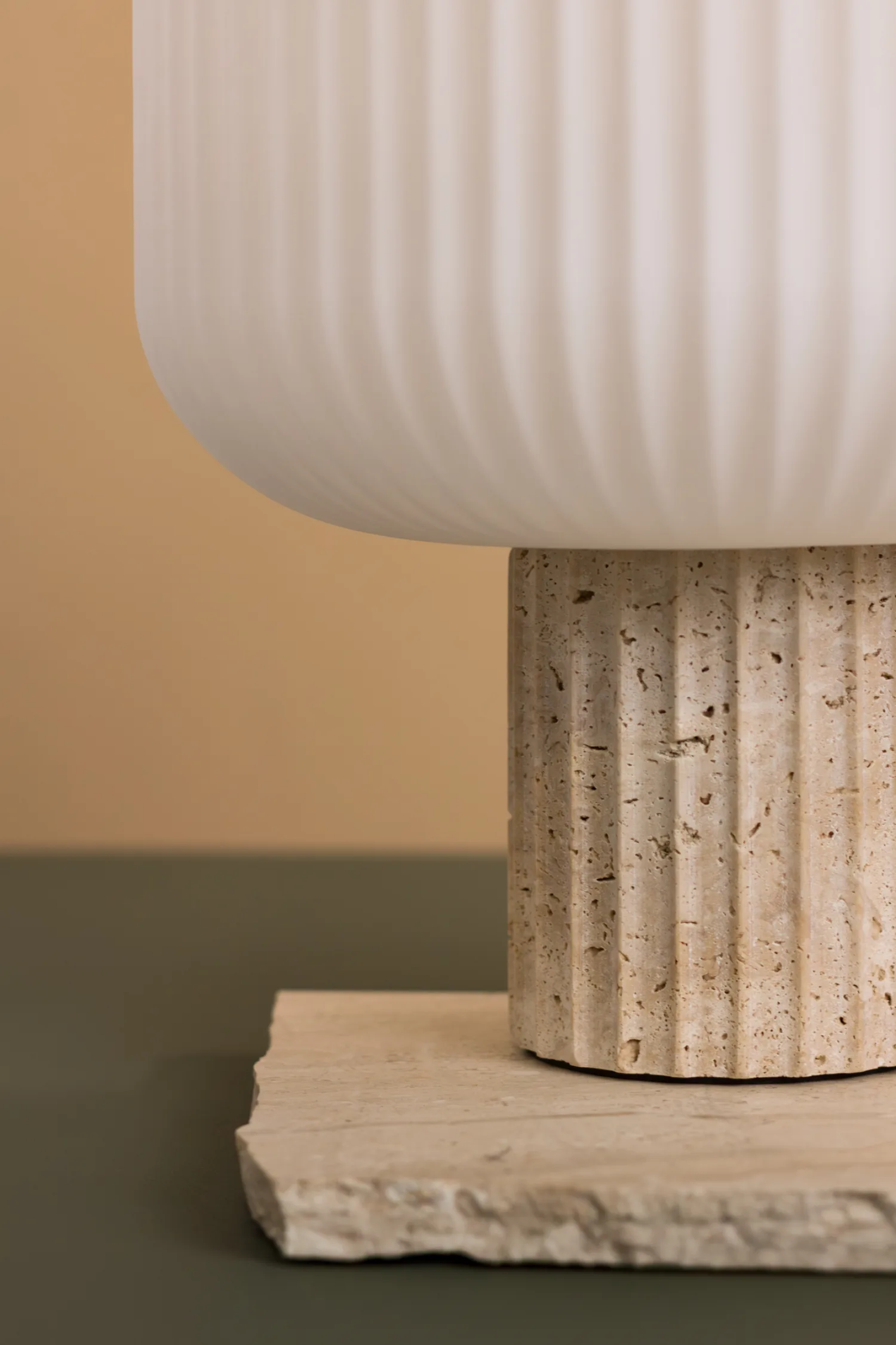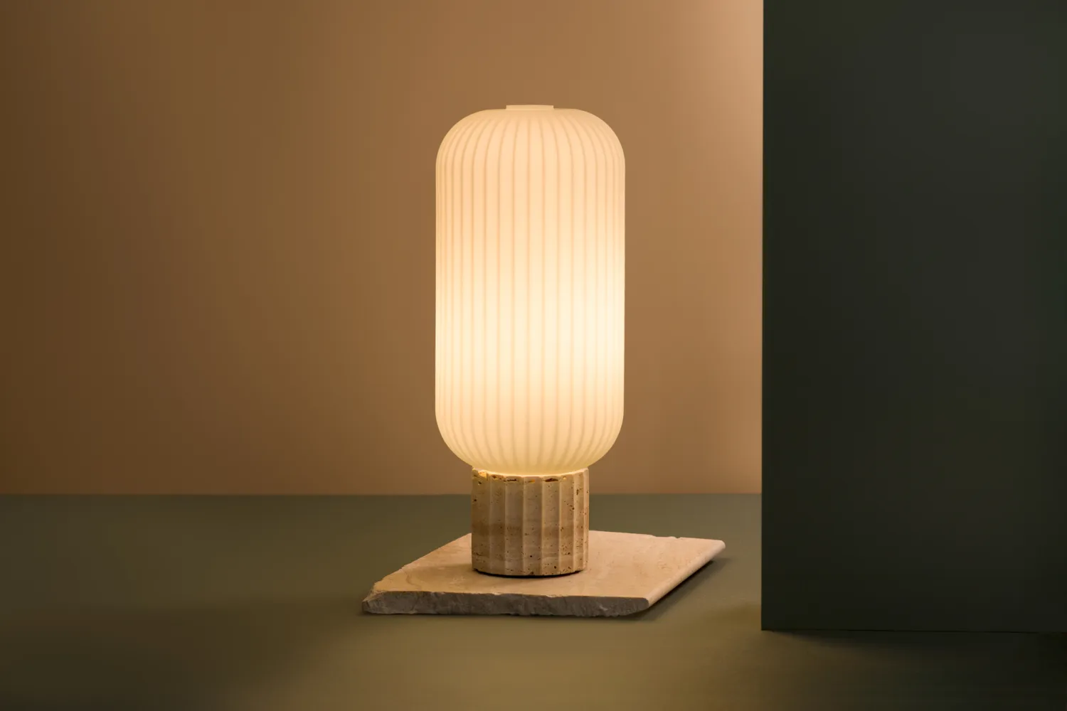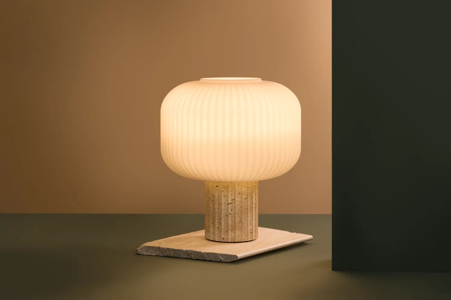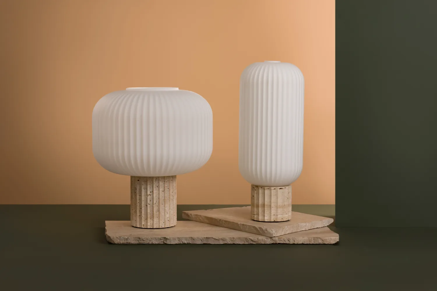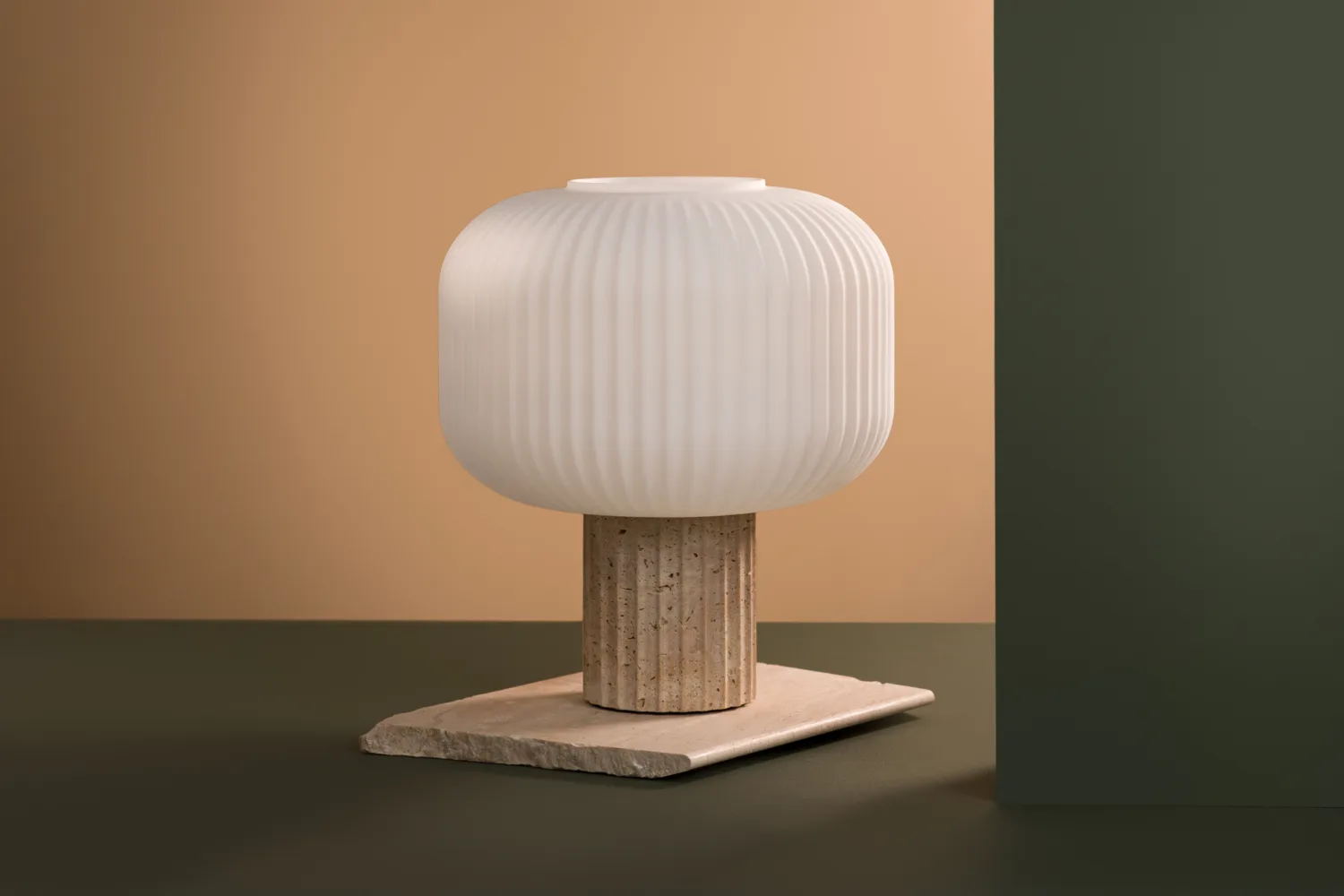 Softly ribbed white glass meets the natural texture of travertine in LYKTA, a design that radiates understated elegance. Available in two shapes, each piece casts a warm, diffused glow, making it perfect for adding gentle light and sculptural presence to bedrooms, living spaces or home offices.