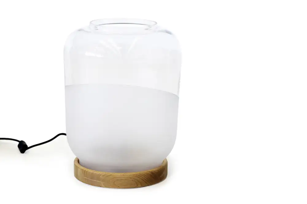 Transform any room with the captivating elegance of the Vasetto Table Lamp! This exquisite piece features a blend of clear and sandblasted glass for its body, delicately balanced atop a sleek light wooden base.