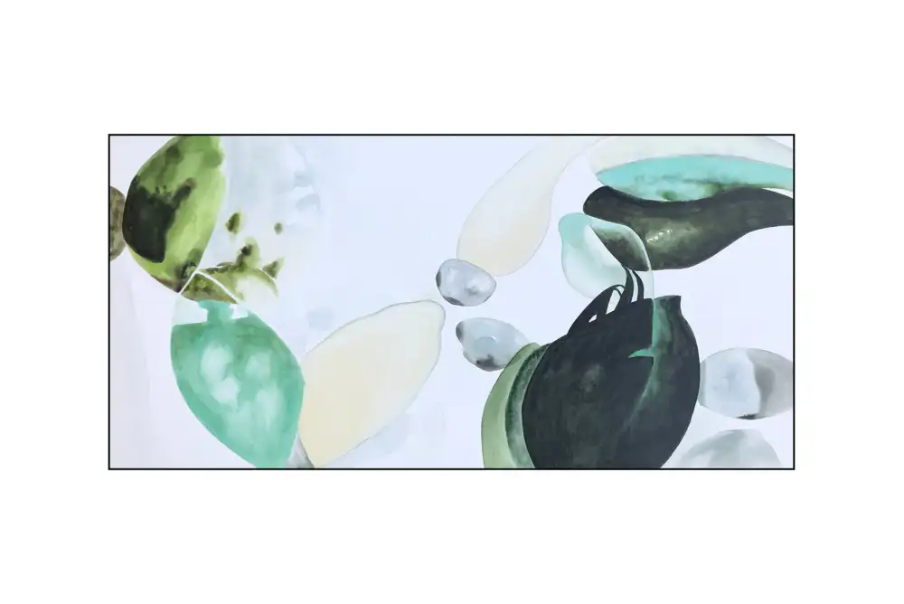 Soft blues, greens and white droplets make up petal like forms in Petalo - it comes finished with a thin black frame.